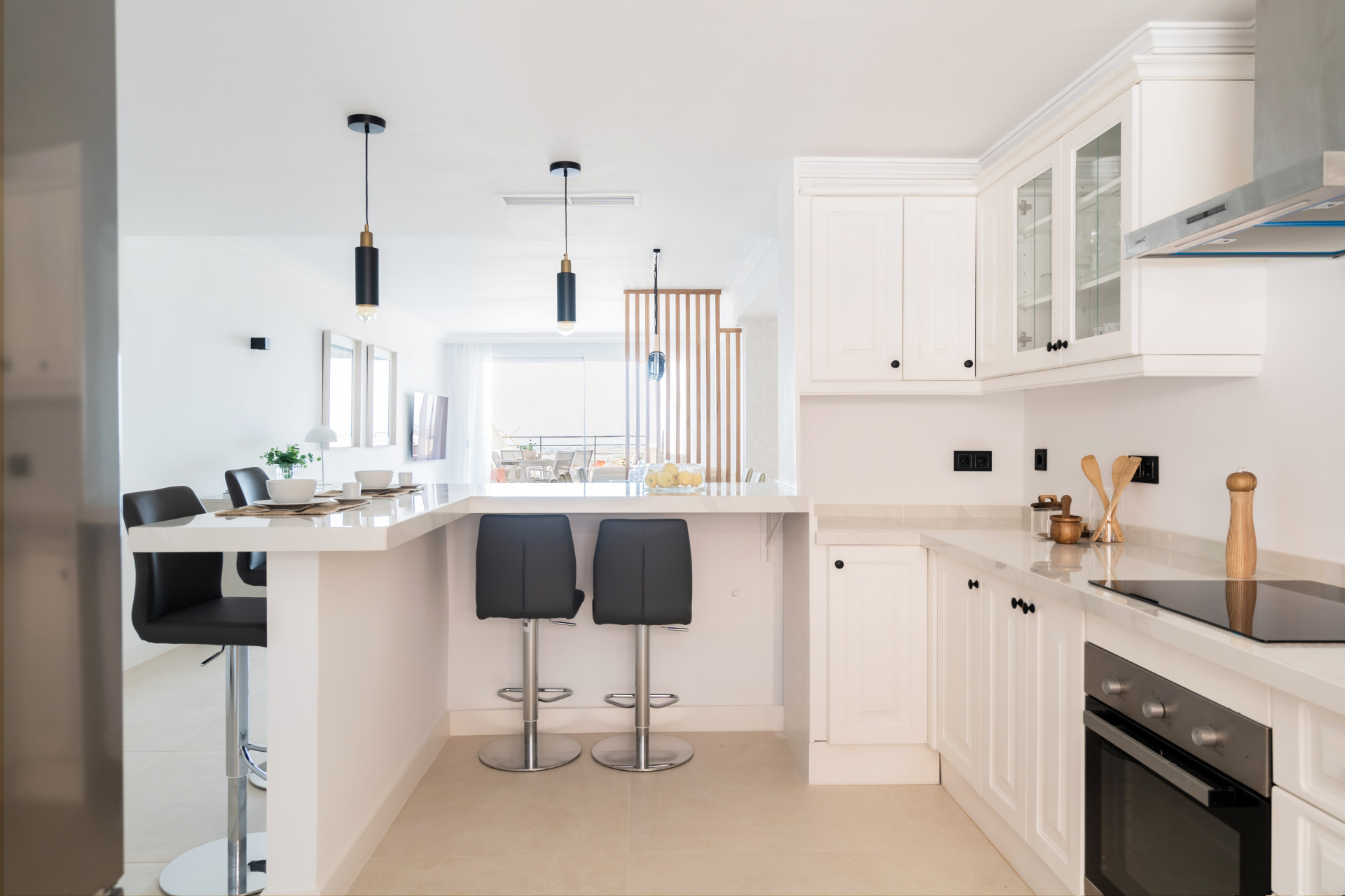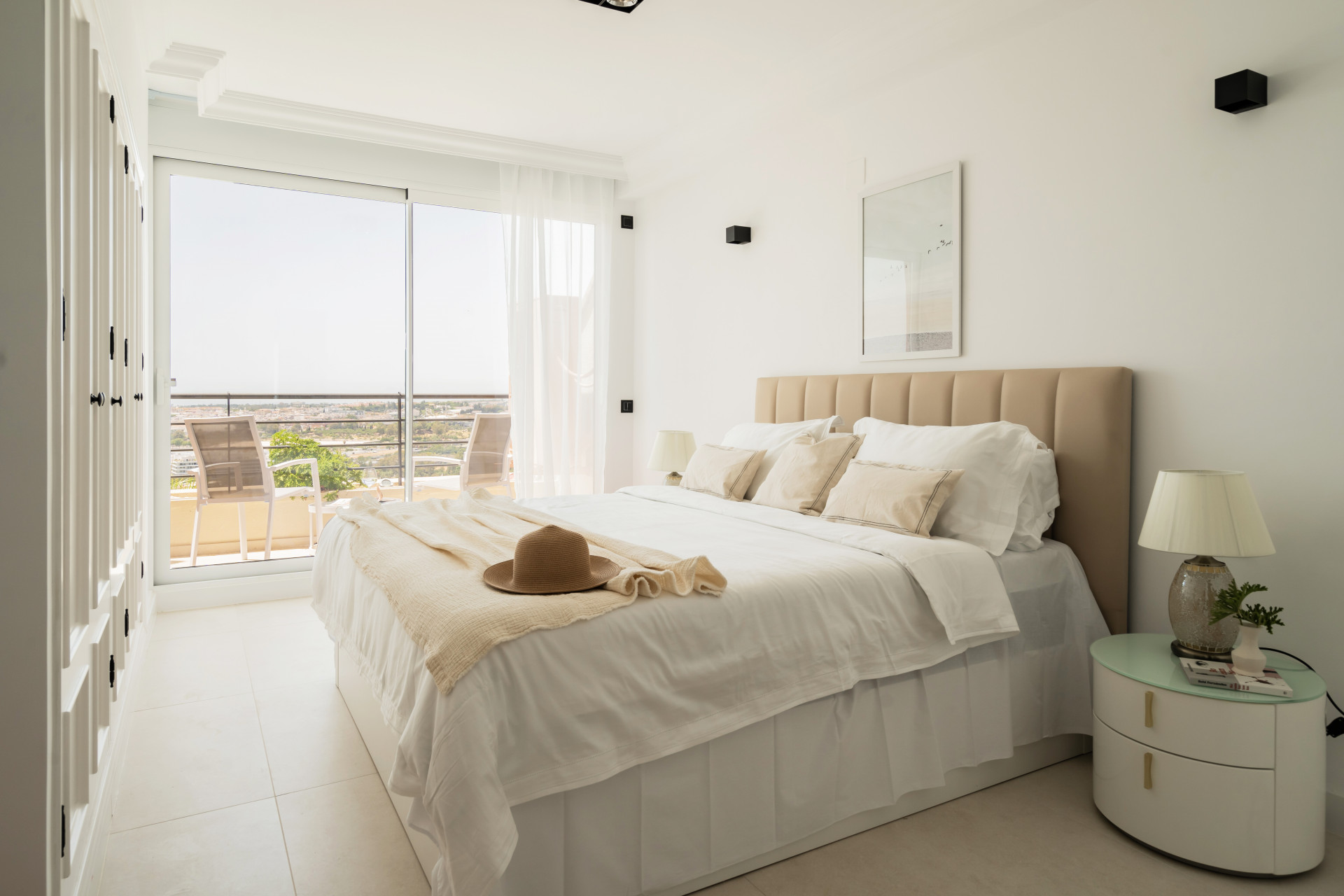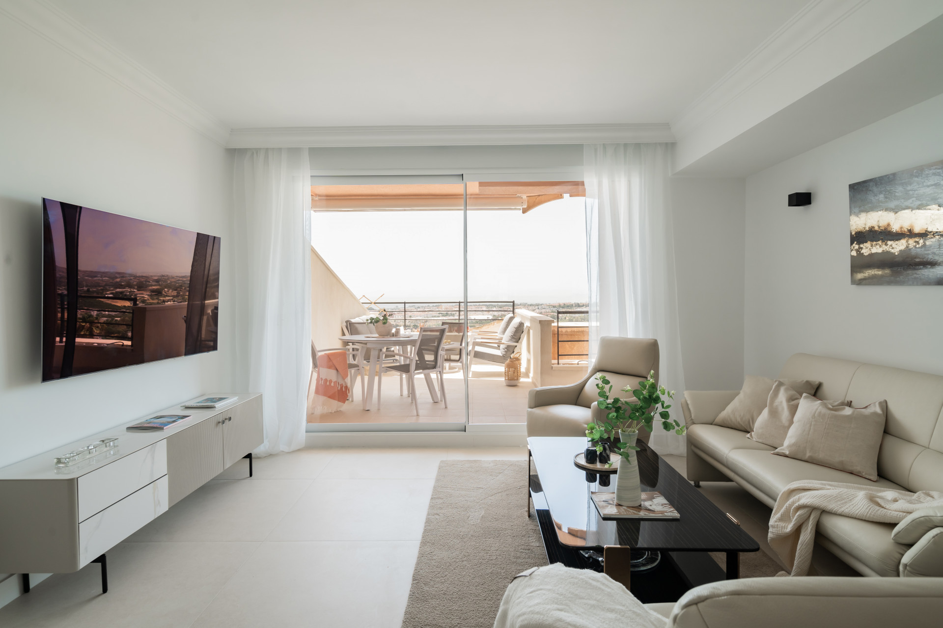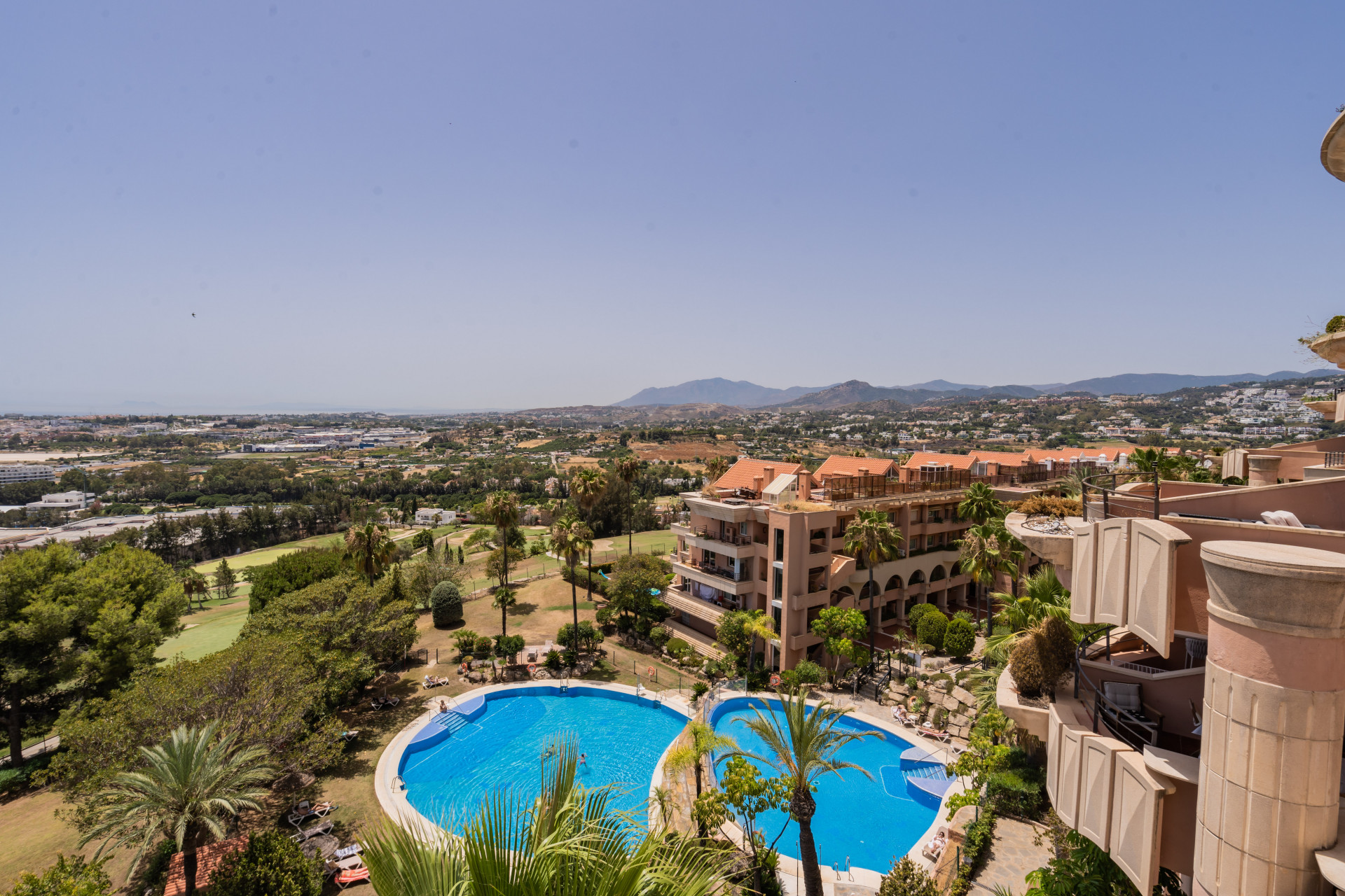 Welcome to this lovely 2 bedroom apartment with the most amazing panoramic views. Upon entering the apartment you have immediate views towards the sea, coastline and mountains. It has recently been renovated, consisting of a large open plan kitchen with great space and a breakfast bar, connected to the dining and living area. Direct access to the terrace facing west overlooking the pools, golf course and the sea. Further there are 2 great sized bedrooms with built in wardrobes, where the master bedroom is en suite. From the master bedroom you have access to the terrace as well.