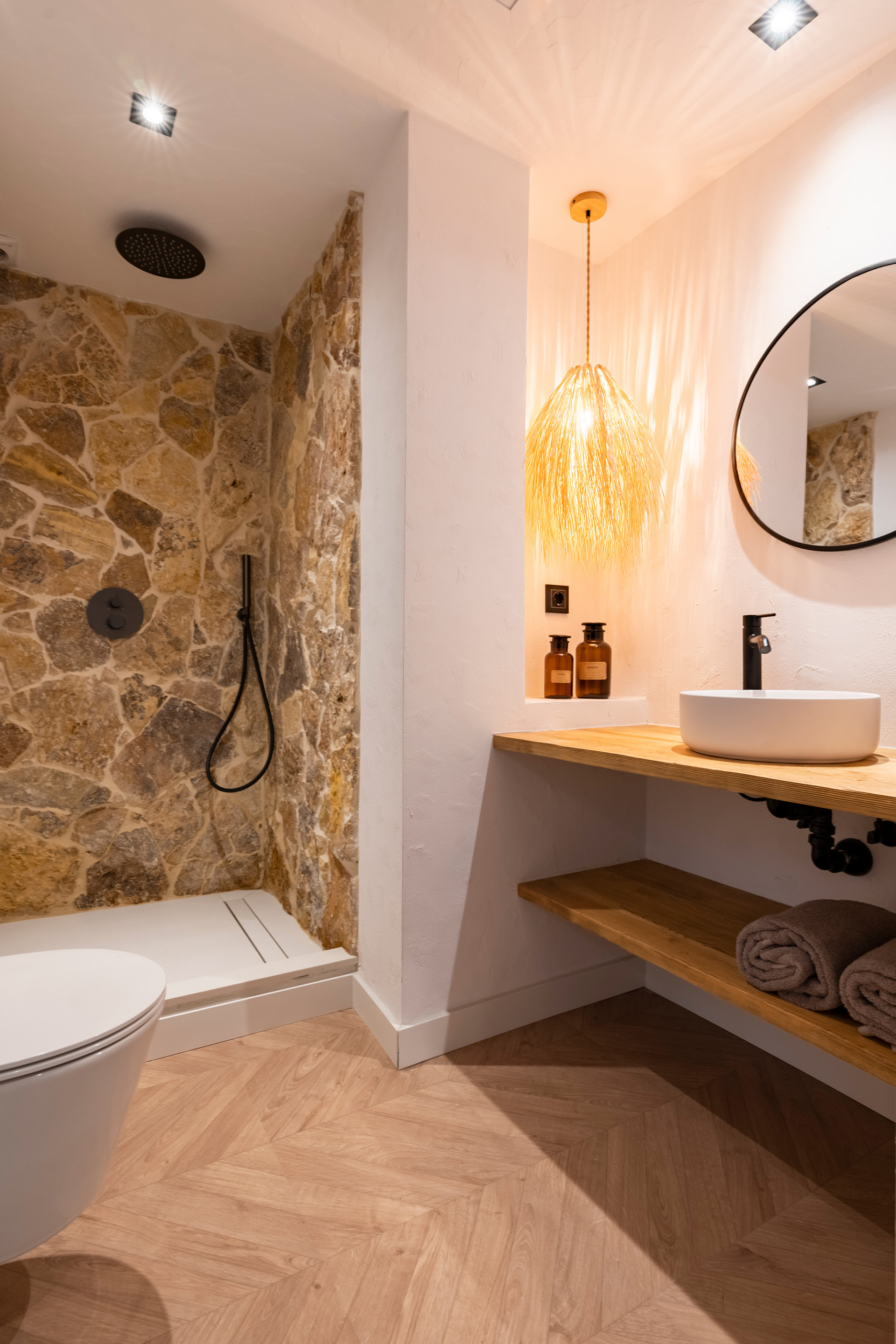 Also on the ground floor are two fully furnished double bedrooms with fitted wardrobes and a feature bathroom, with a built in stone shower and trendy sink and vanity unit. In this bathroom, behind mirrored doors is a hidden washing machine and dryer, utilising the space magnificently.