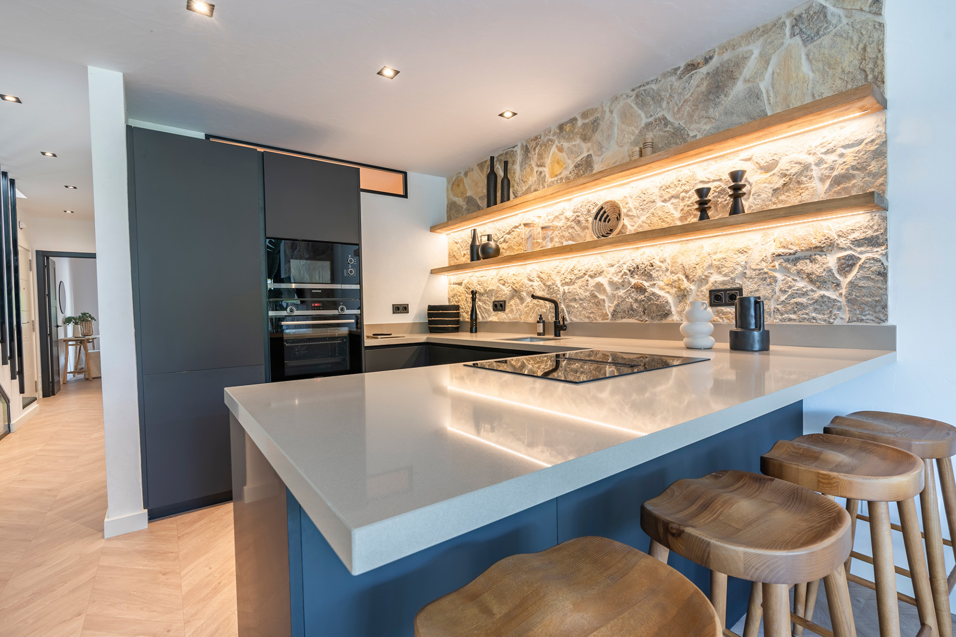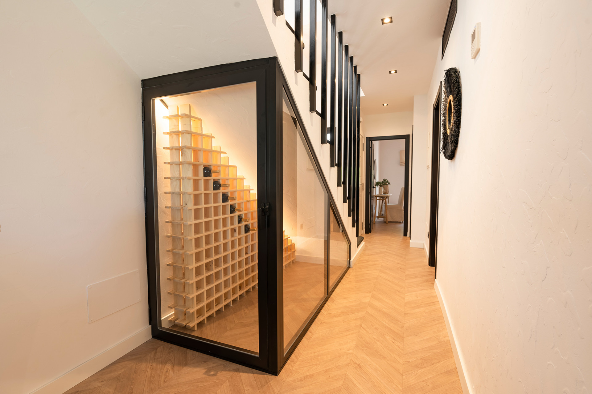 The ground floor has an open plan layout with a beautiful kitchen, complete with high end appliances, worktops and an amazing stone feature wall! The dining area seats 6 people and also has its own custom made “wine bodega”. The lounge is impeccably furnished and features a stone fireplace with a living flame fire, giving a real homely feeling to the area. The lounge is further complemented by opening out onto the lovely south facing terrace, complete with a dining table and chairs and from here you can also access the communal gardens.