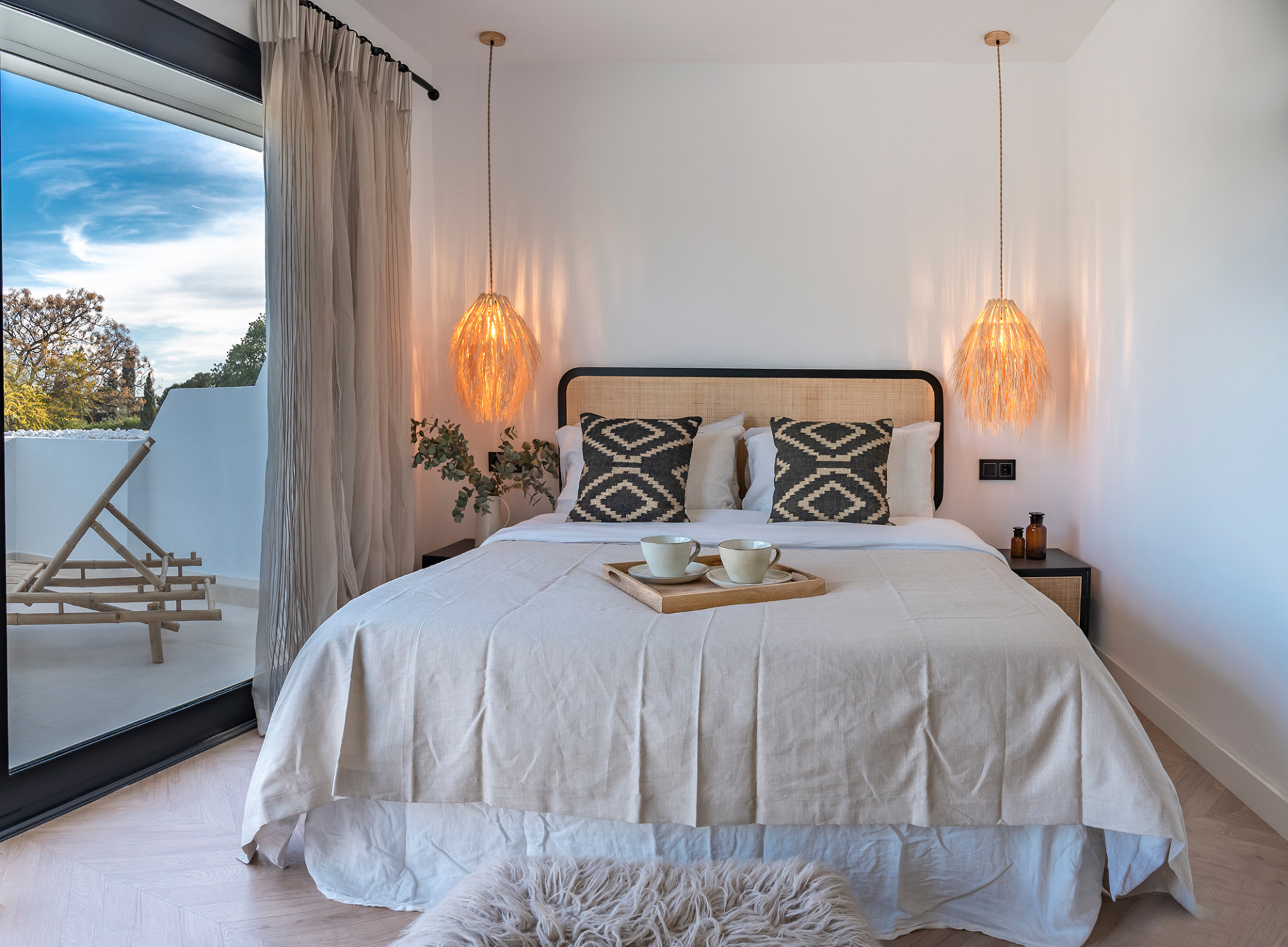 On the first floor we have the master bedroom with beautiful views over Aloha Golf course. The bedroom has a private terrace with sun loungers and the bedroom itself features mirrored fitted wardrobes, a dressing table and bed which are complimented with beautiful furniture and curtains. The en-suite bathroom has a feature stone wall with designer free standing bath, double sinks, suspended toilet and a walk-in shower, again with feature stonework.
