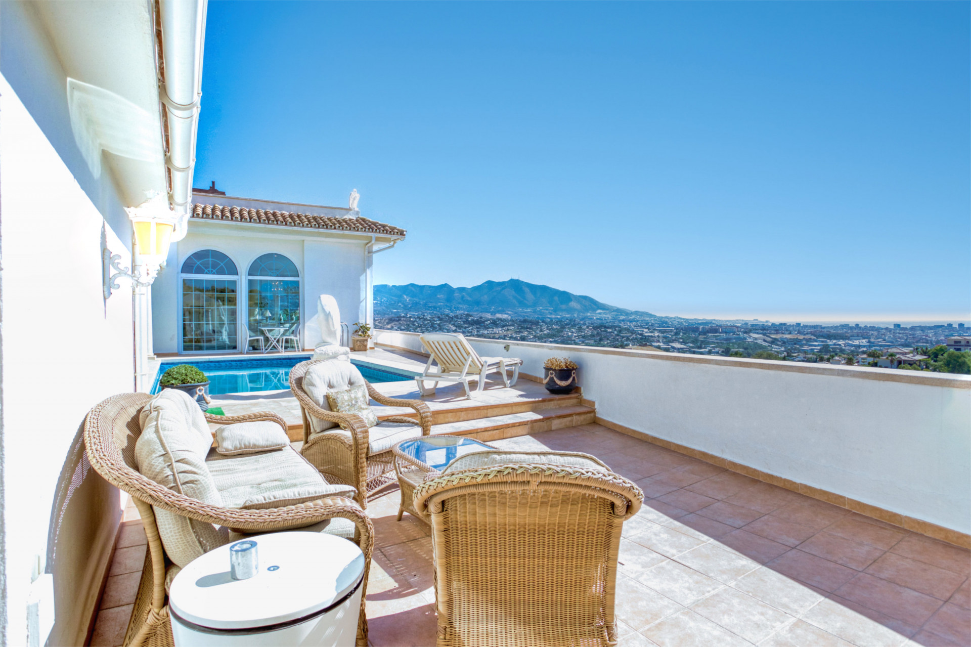At one of the highest plots in Cerros de Aguila we now have this fantastic villa for sale, Villa Rosa de Los Vientos gives you a spectacular view of the mountains of Mijas, the Mediterranean Sea and Fuengirola. Social areas with open floorplan between kitchen and living room. It has a separate guest apartment with its own kitchen and private terrace.