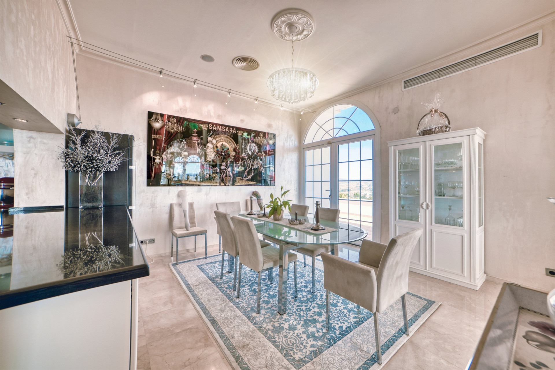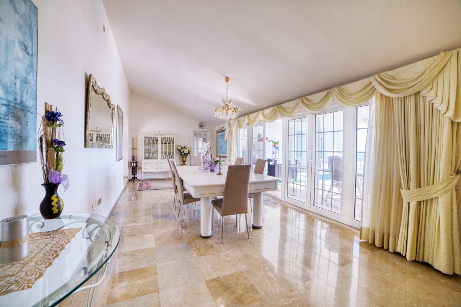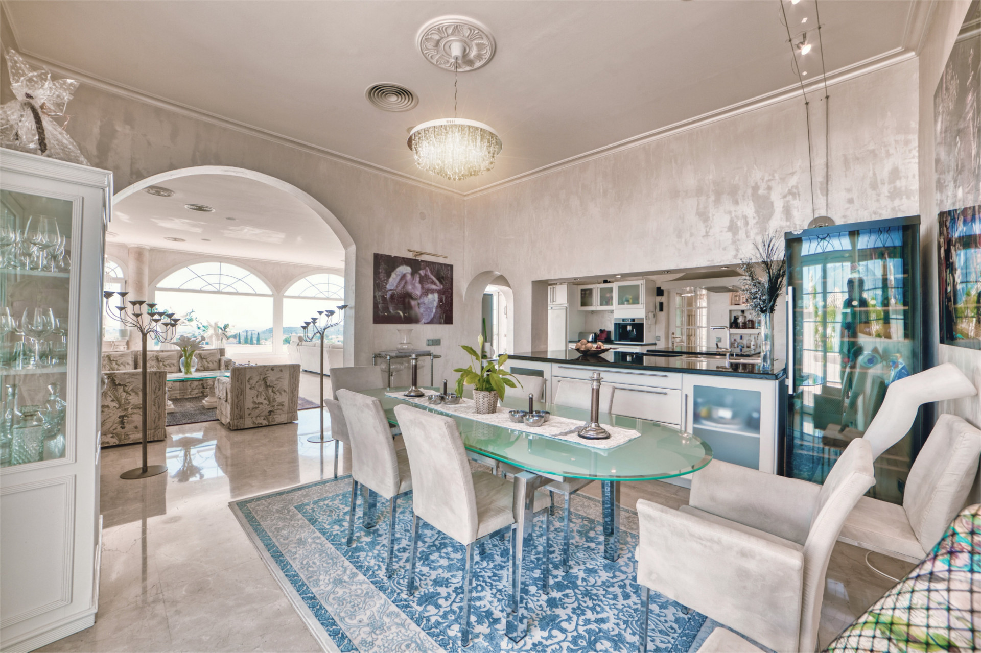 Entering the villa, you will find a hallway leading into the dining room with a open fireplace. Here is a large dining table that can also be converted to a pool table for social gather after dinner. Take a left and you are entering the kitchen and launch area in open plan with a open fire, and a magnificent panoramic view.