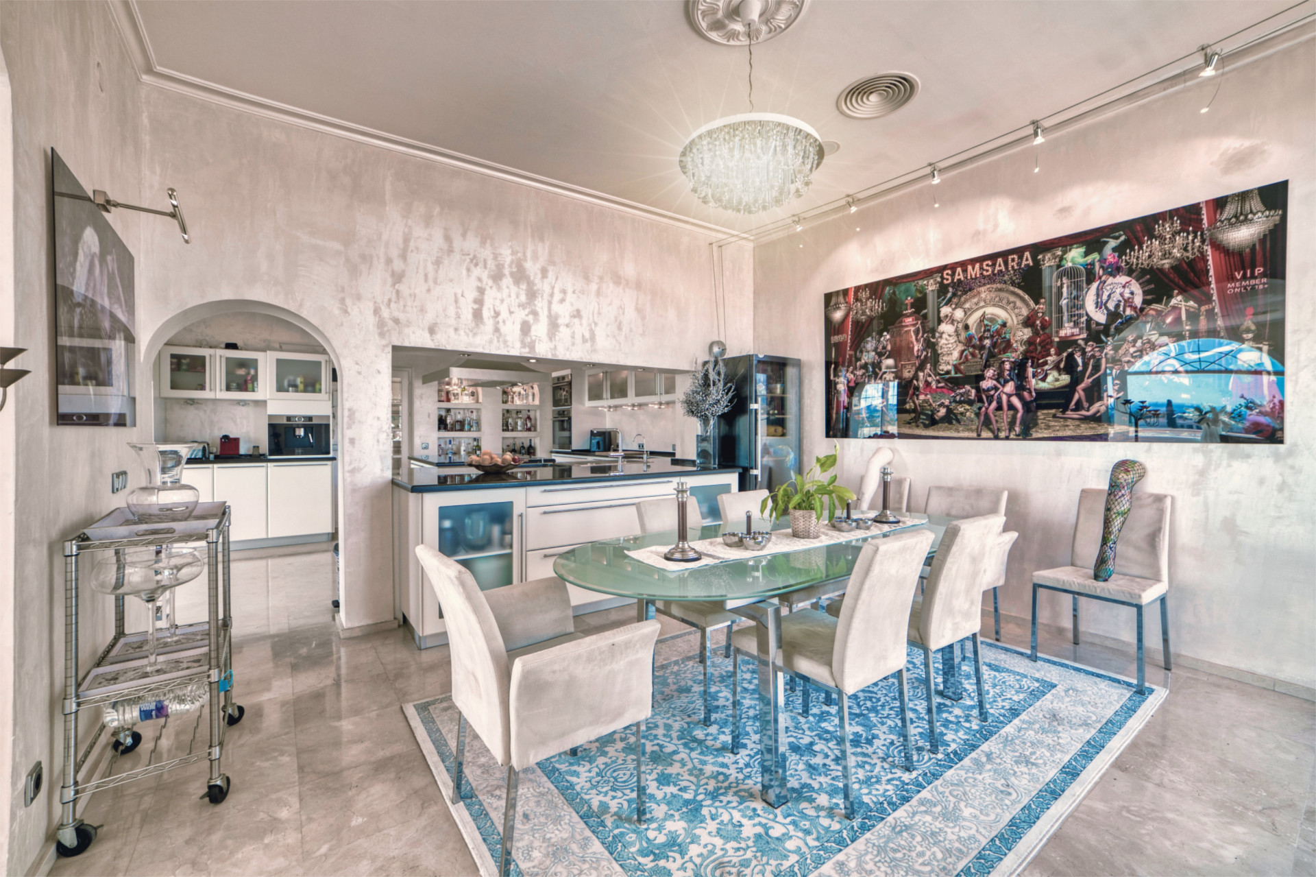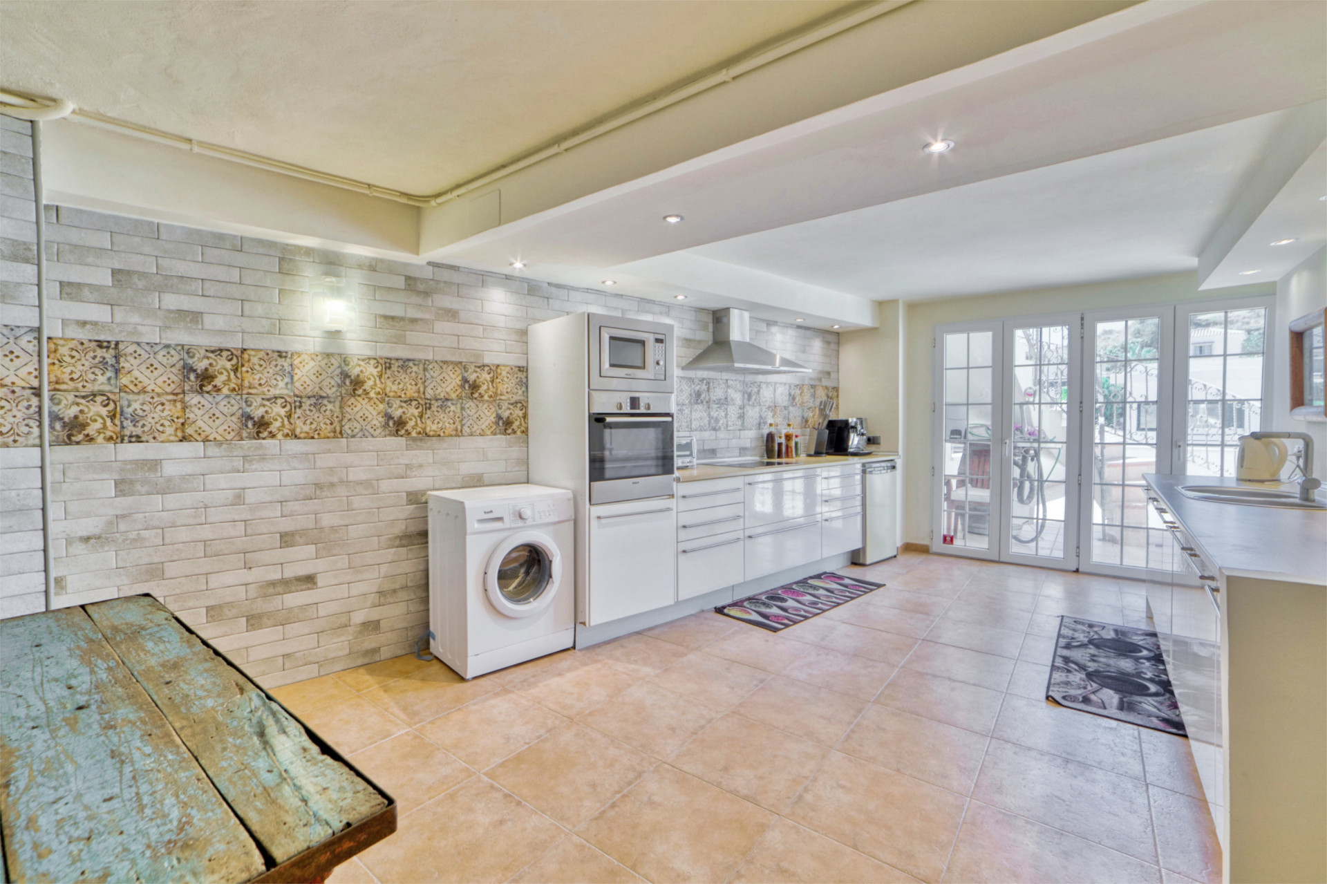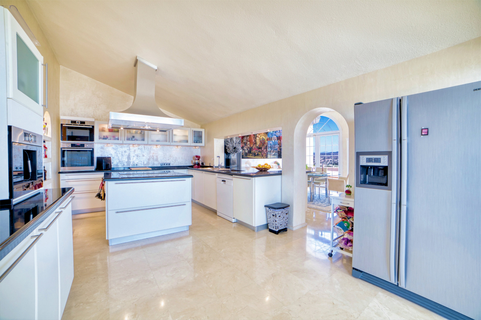 The open kitchen is centered around a kitchen island and well equipped with high quality state of the art appliance’s (Double fridge/freezer with icemaker, integrated coffee machine, a large vine fridge etc.).