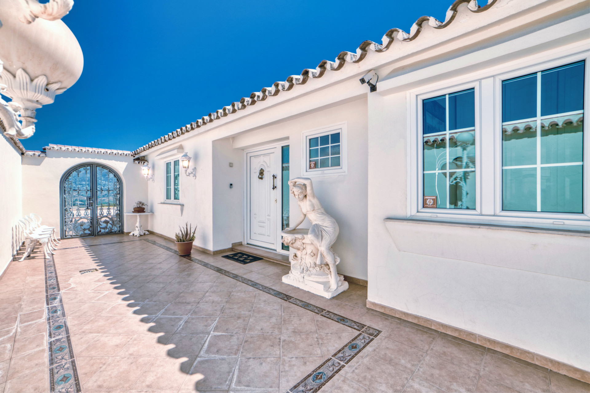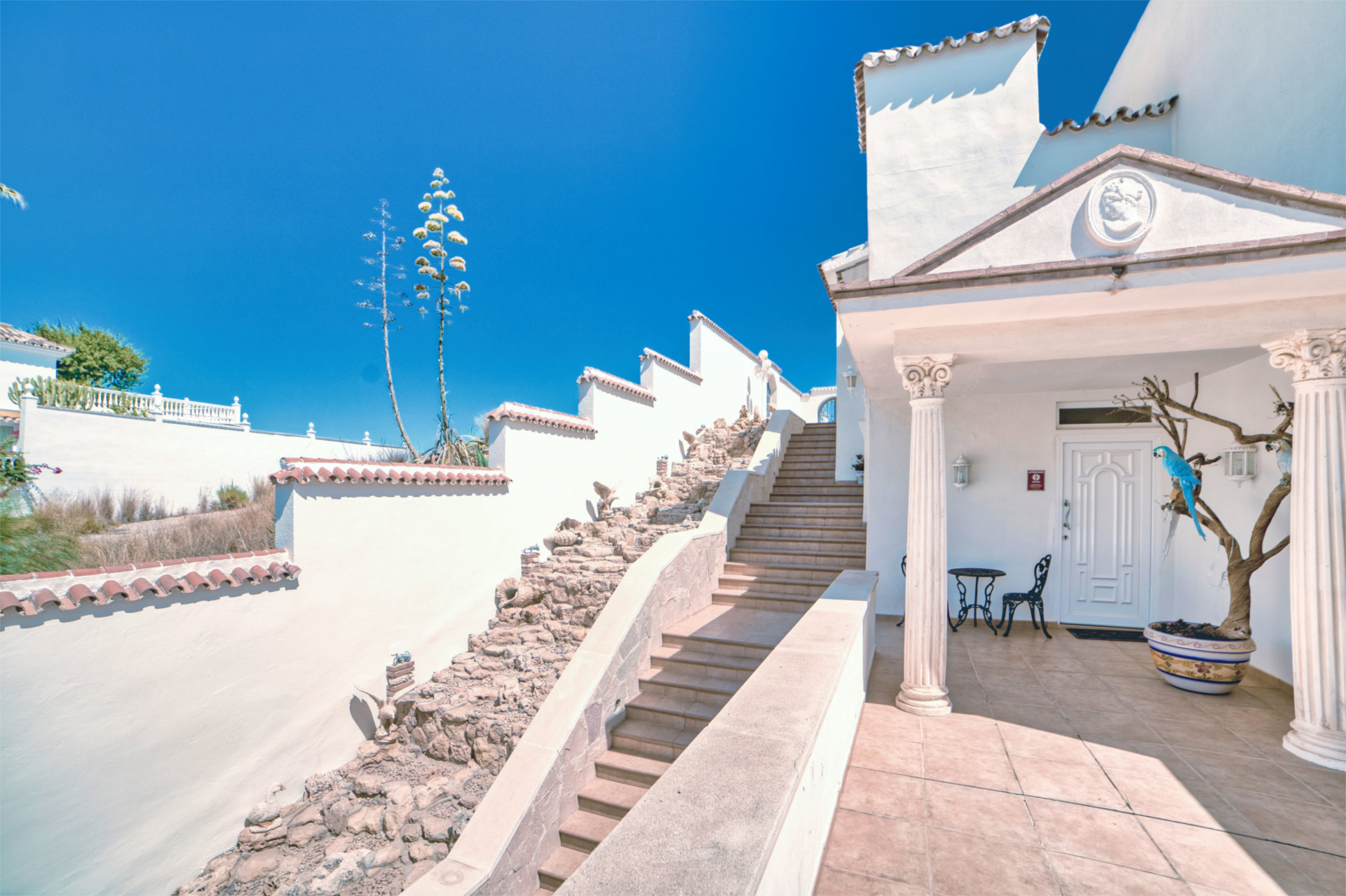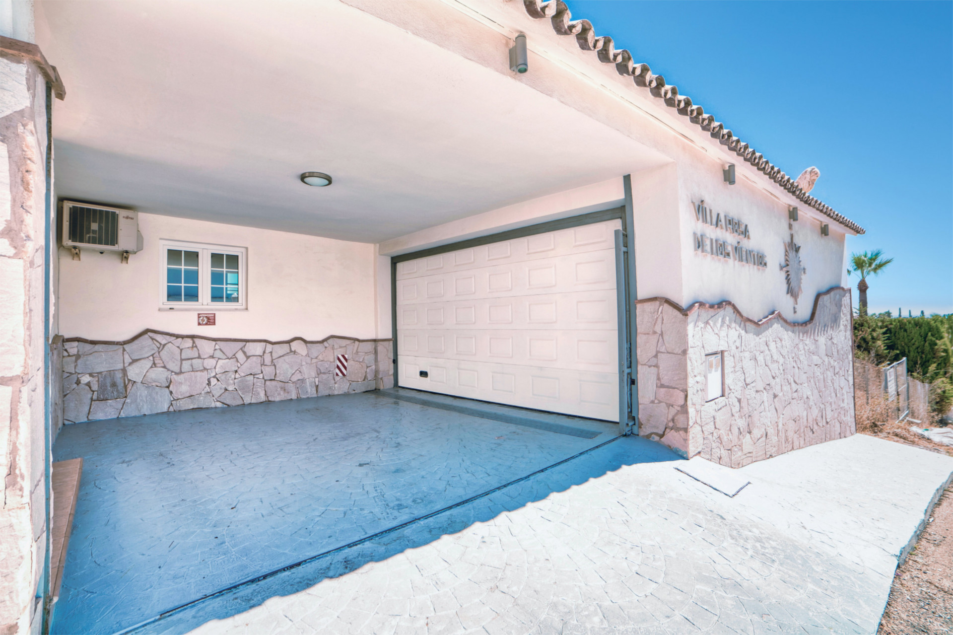 Entering the gate to the property there is a nice waterfall following you as you take the stairs takes up from the street level to the main entrance. You can also take the elevator from the large garage. The garage is large enough to have place for several cars still leaving space for a gym.