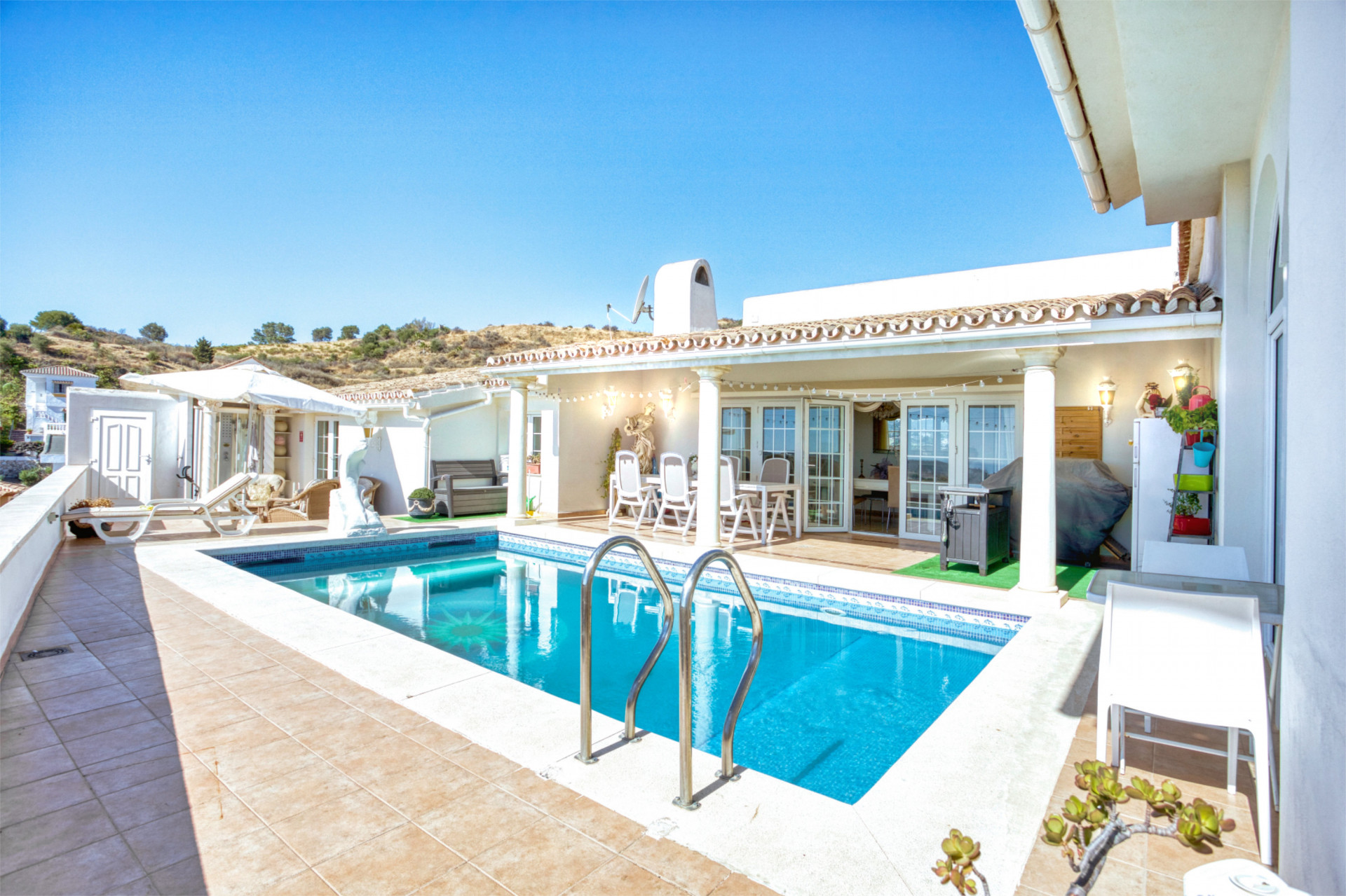 Around the pool there is a sun deck but also a covered area with shades for relaxing and dining, with in convenient reach the barbeque and fridge.